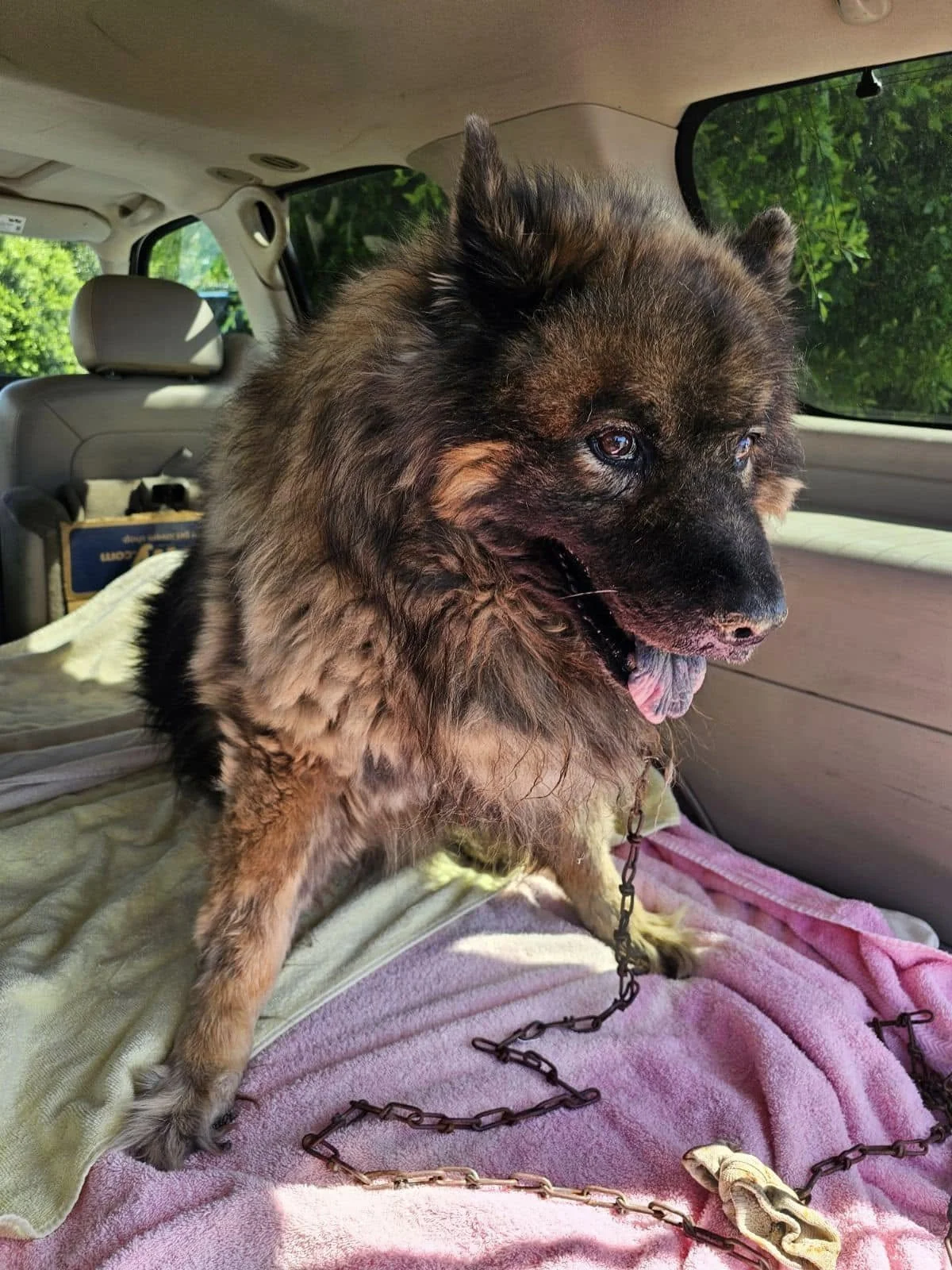 On 4/24/24, Southern California Keeshond Rescue welcomed Lycus, formerly known as Osito, after his owner, relocating and unwilling to keep him, planned to surrender him to a shelter. Lycus had spent six years chained outside, and the first photo shows his severely matted coat and the rusty chain he wore. Thankfully, a group of caring individuals intervened, rescuing him and alerting us.